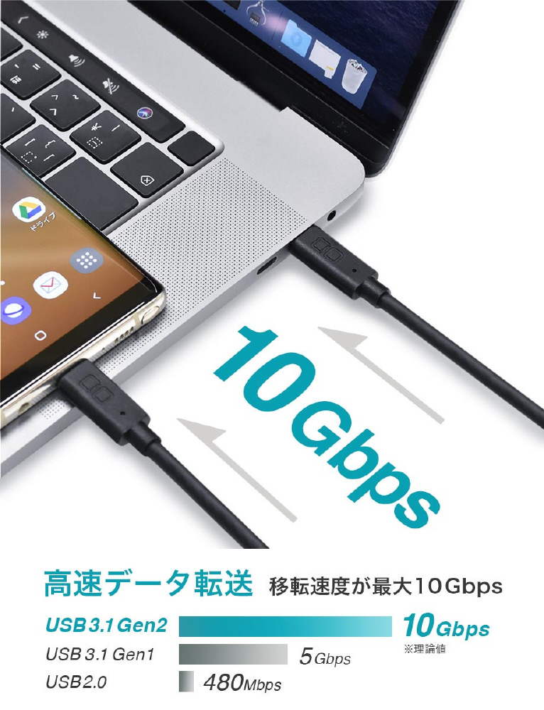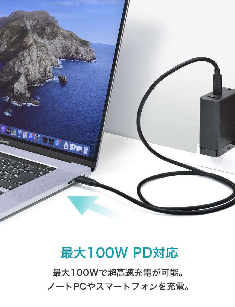 様々なType-Cデバイスへの充電・出力・転送が可能なUSB Type-C to Type-Cケーブルです。USB PD(PowerDelivery)対応のより、最大100Wの超急速充電が可能。