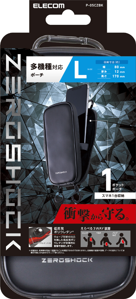 スマートフォン用キャリングポーチ/ZEROSHOCK/カラビナ付キ/ベルトループ/3WAY装着/シングルポケット/Lサイズ ブラック P-05CZBK