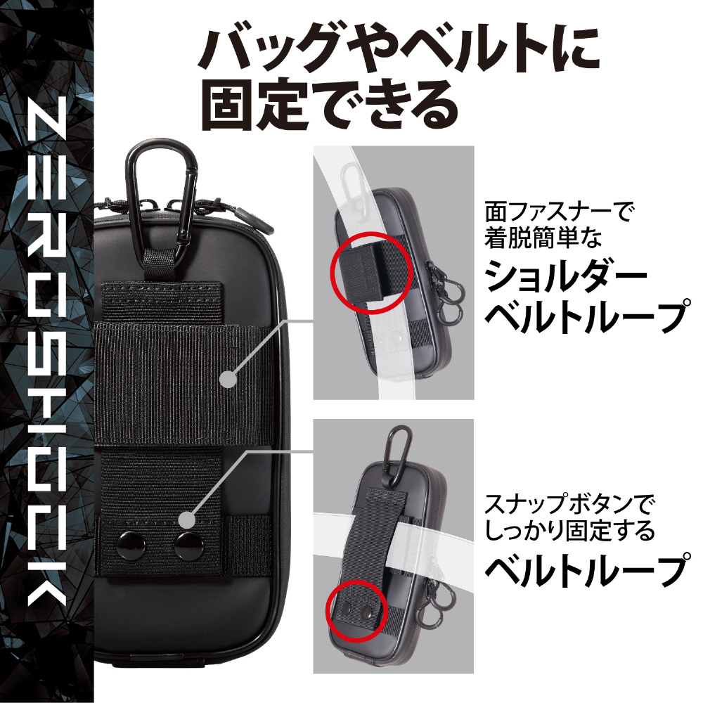 抜群の衝撃吸収力を持つ“ZEROSHOCK”シリーズ!ベルトループ、ショルダーベルトループ、カラビナフックを装備し、必要に応じて3つの装着方法を選べるスマートフォン用キャリングポーチ。