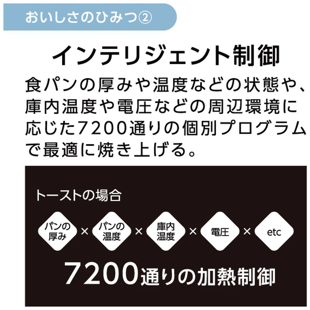庫内温度や周辺環境に応じた7200通りのプログラムで、厚切りも、冷凍も、外はサクッ、中はふんわりあつあつのトーストを実現。