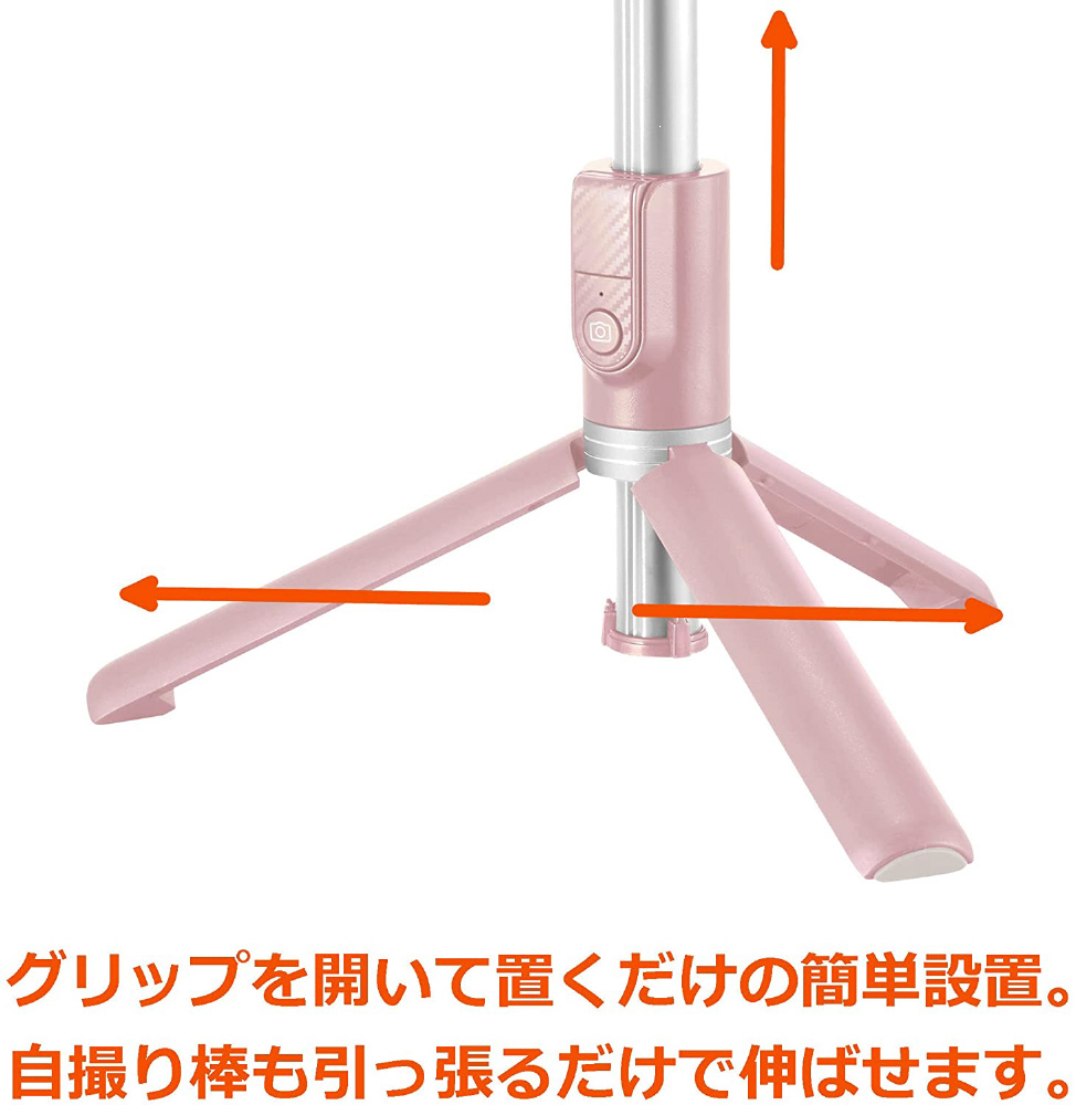 グリップを開いて置くだけの簡単設置。自撮り棒も引っ張るだけで伸ばせます。