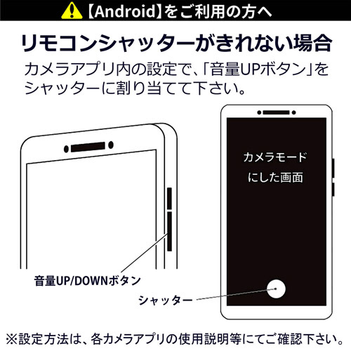 Andoroid OSのスマートフォンで本製品のリモコンシャッターを使う場合は、カメラアプリ内の設定で「音量UPボタン」にシャッター機能を割り当てておく必要があります。