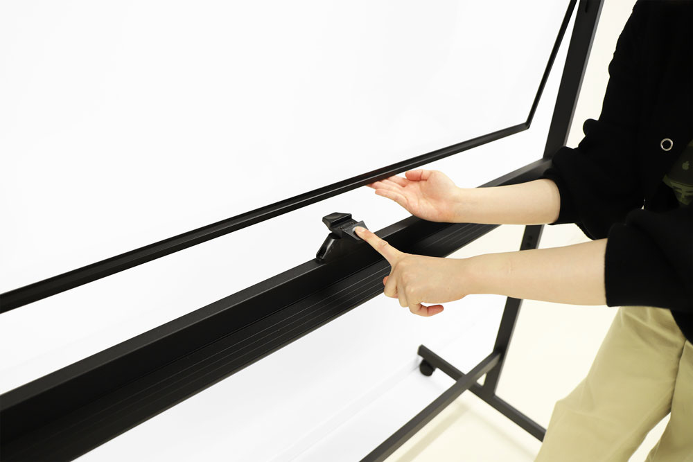 ストッパーの取手を押すだけで板面がクルっと回転、カチッと固定!ワンタッチで簡単に使用面を切り替えられます。※板面が回転できるスペースが必要です。