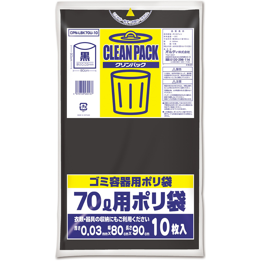 ポリ袋 CLEAN PACK(クリンパック) CPN-LBK70U-10 [70L /10枚 /黒]