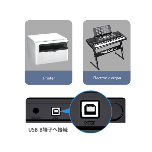 お手持ちのType-Cケーブルでプリンター接続や、MIDI楽器に接続する事が可能になります。(L字タイプ)