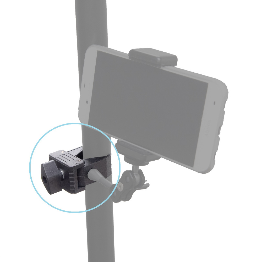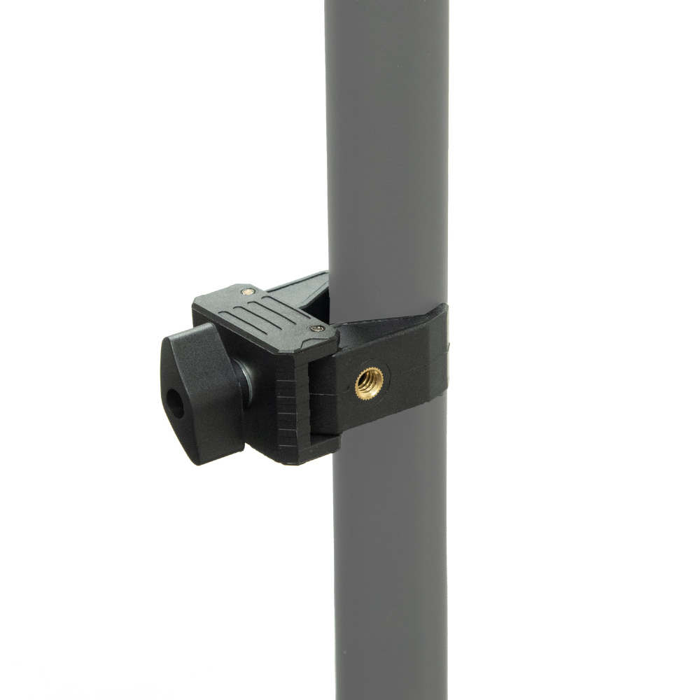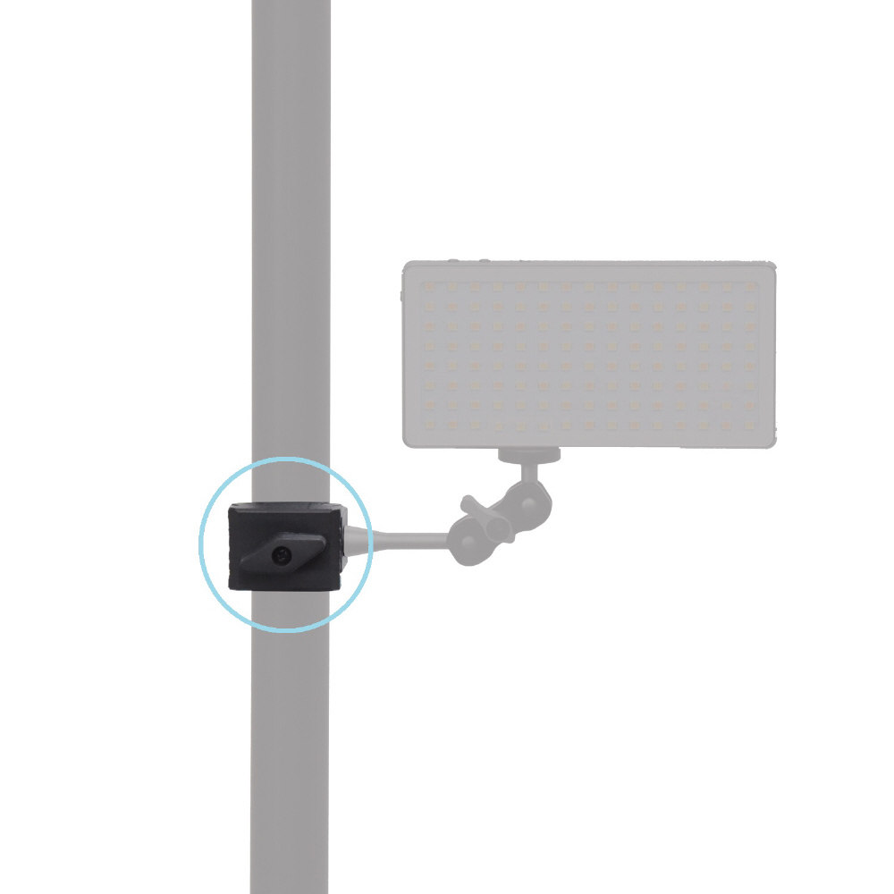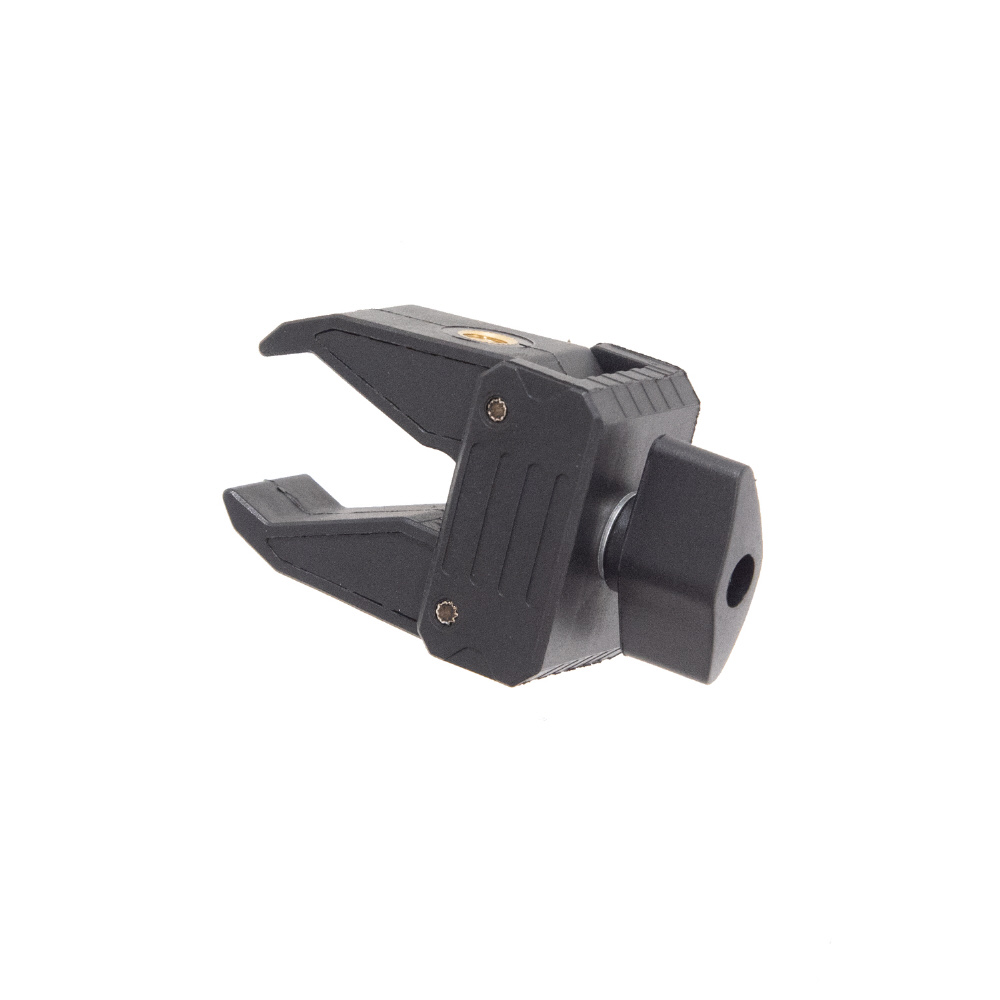 三脚の脚、ライティングポール、テーブルなどに挟んで固定でき、モニターやライトなどの各種アクセサリーが装着可能です。