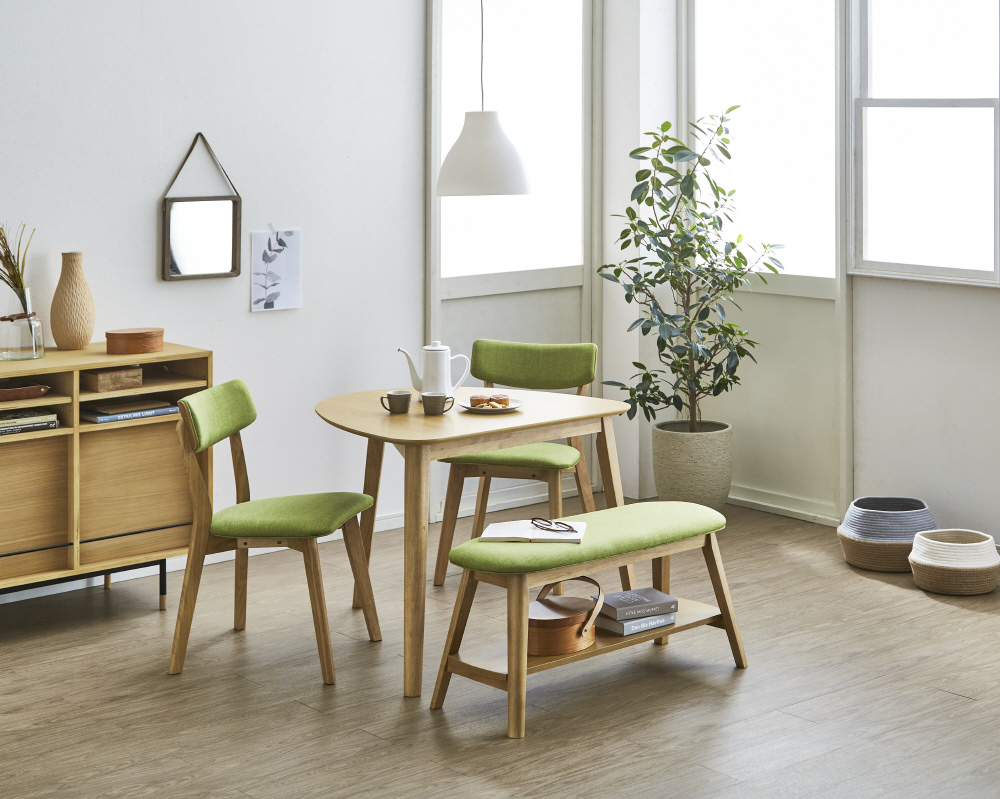座面の下に収納棚がついたおしゃれなベンチ。散らかりがちなダイニングも、すっきりスマートに。脚/ブラウン・座面/グリーンのベンチです。