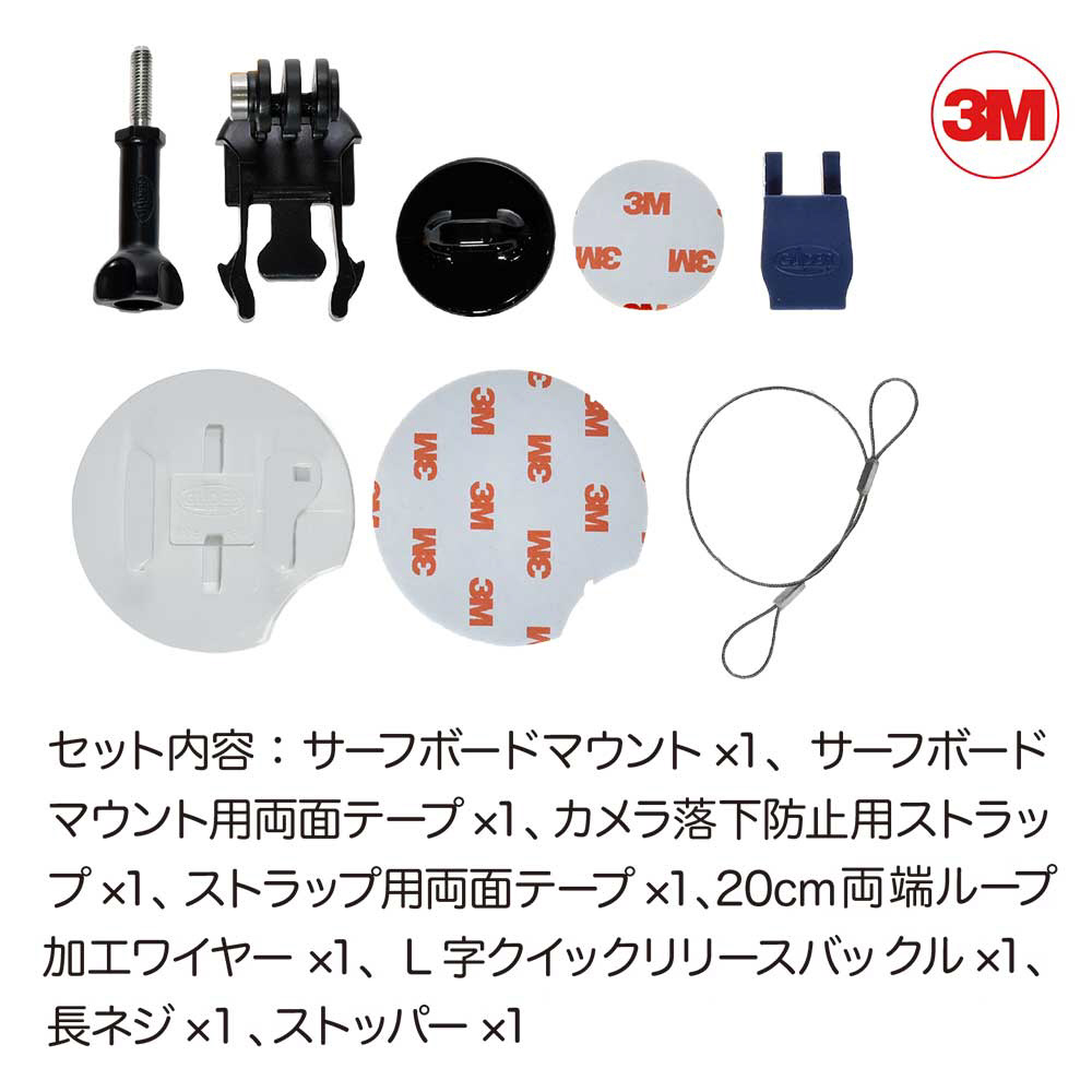 ●セット内容:サーフボードマウント x1、サーフボードマウント3M両面テープ x1、カメラ落下防止用ストラップ x1、ストラップ用3M両面テープ x1、20cm両端ループ加工ワイヤー x1、L字クイックリリースバックル x1、長ネジ x1、ストッパー x1