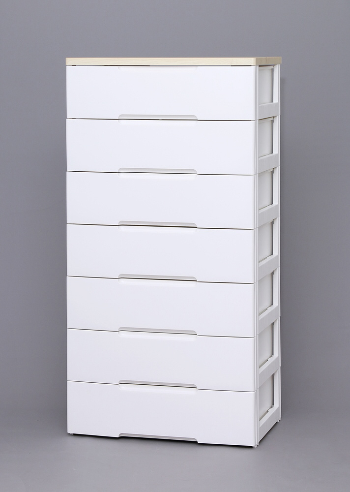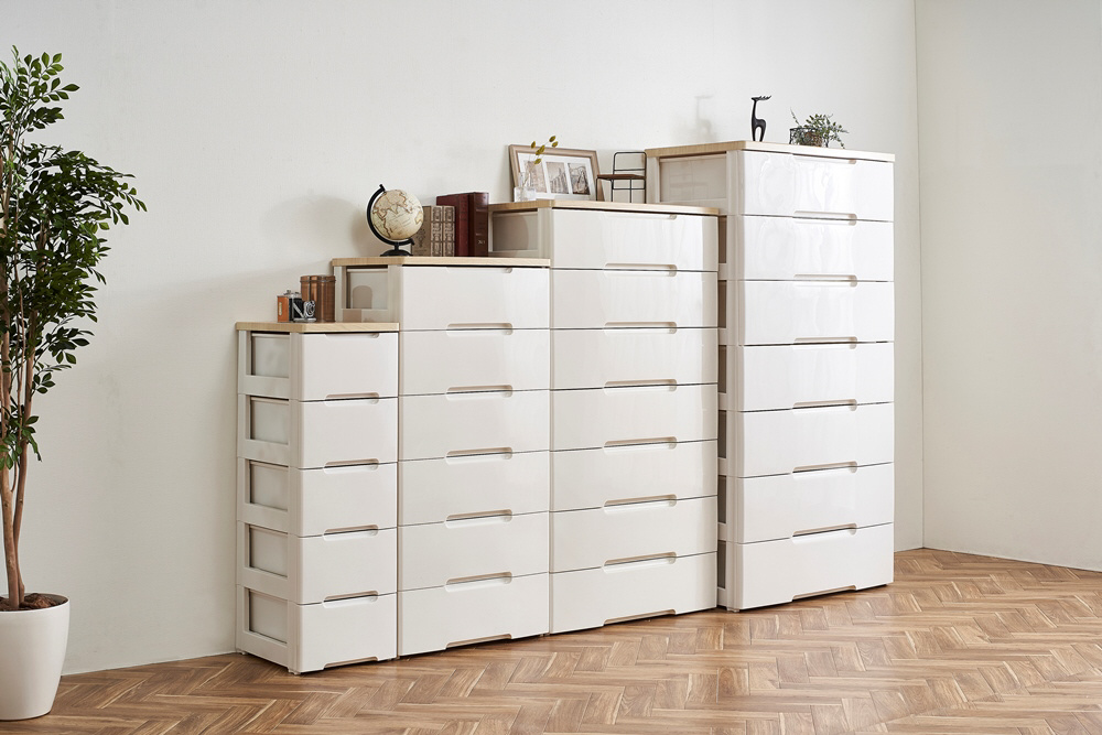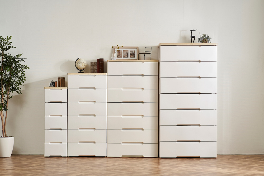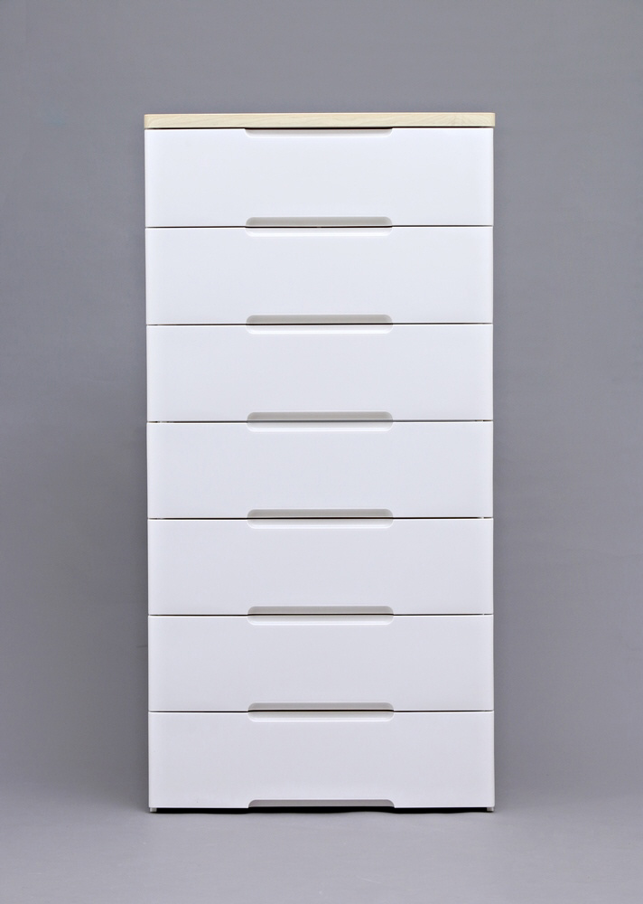 リビングや寝室の収納にピッタリの木天板付きのおしゃれなチェストです。木天板は汚れに強く、前板は塗装家具のように質感でデザイン性にも優れています。また、引き出しには開閉がスムーズなスライドレールを採用しています。また、引き出しは幅広なので、Yシャツを横置きなら2列、縦置きなら3列並べて収納できます。