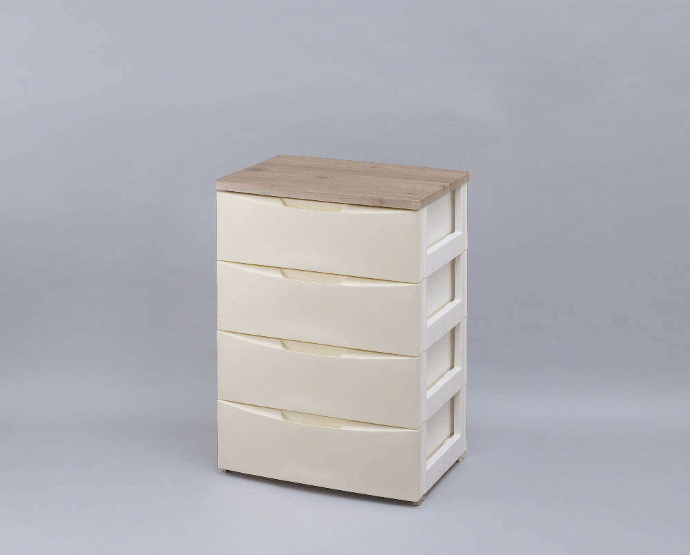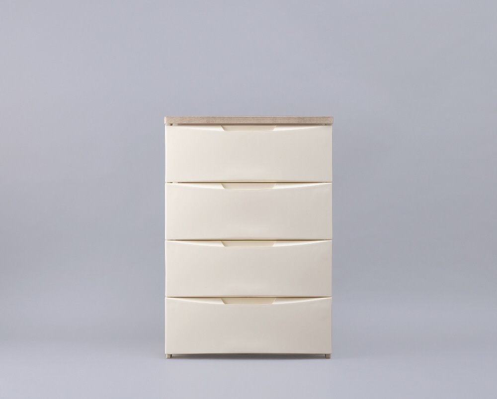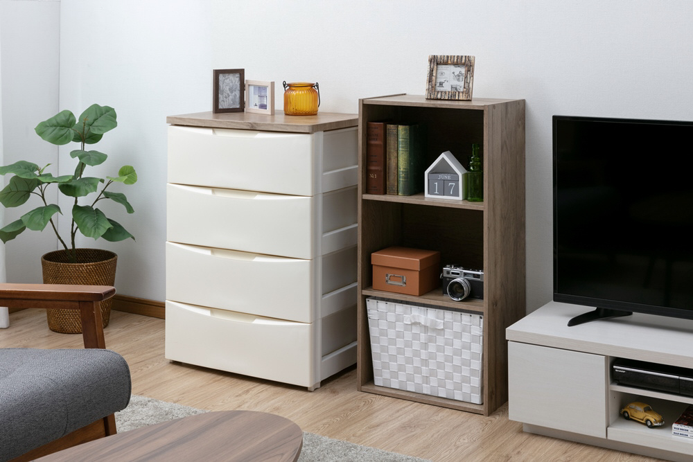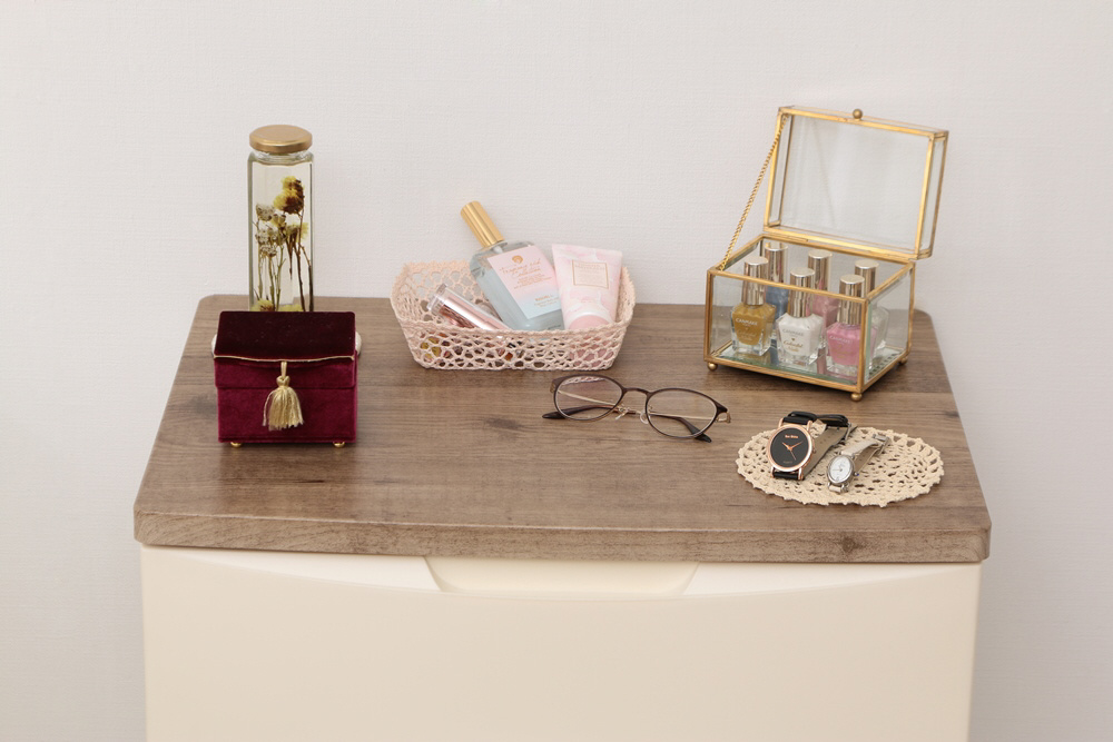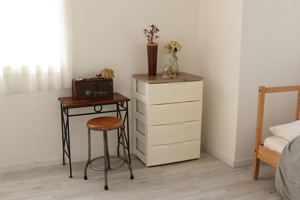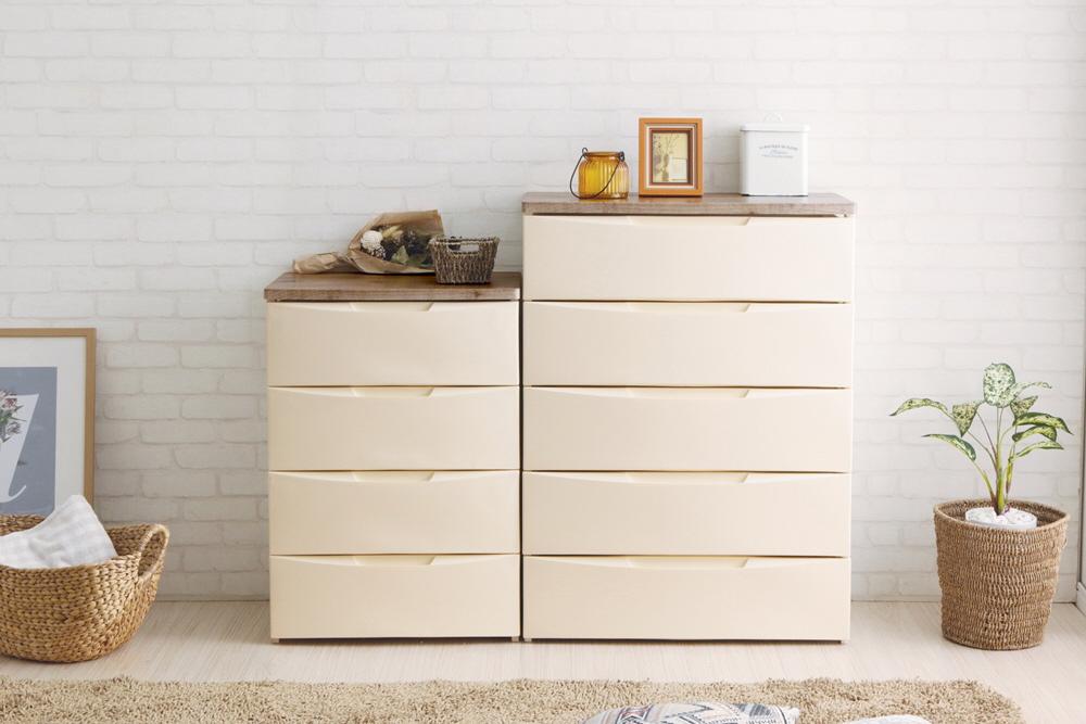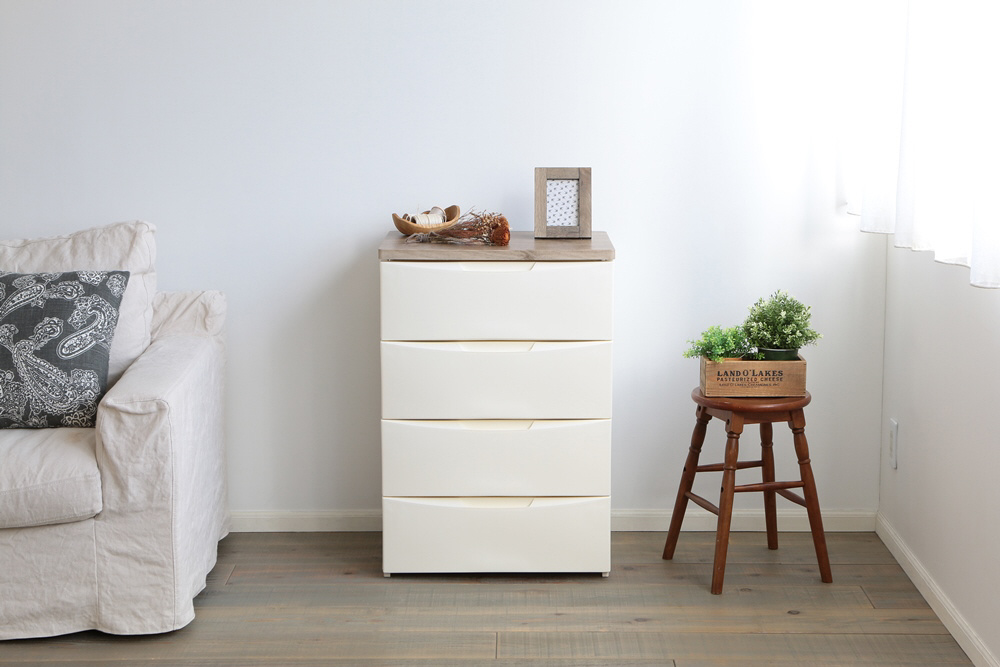 木目調の天板がおしゃれなウッドトップチェストです。落ち着きのあるマットな前面パネルと木目調の天板。引き出しはスライドレールをなので、たっぷり入れても楽に引き出せます。頑丈な天板なので小型テレビや、オーディオ機器も置けます。天板は耐水加工材なので、ランドリーやキッチンなどの水回りでも使えます。