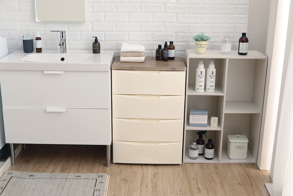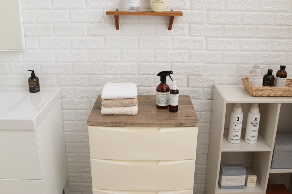 天板耐荷重は約10kg。小型家電も置ける余裕の耐荷重です。耐水性があるのでランドリールームやキッチンなどの水回りでも使えます。