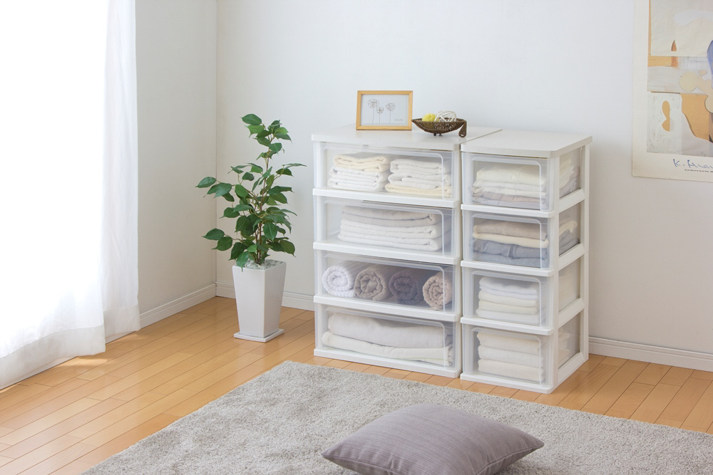 クローゼットや押し入れスペースを有効活用できるチェストです。Yシャツを2枚並べて収納可能です。引き出しにはストッパーが付いており、落下を防ぎます。前後方向への移動がスムーズにできるローラが付いています。組立不要の完成品です。