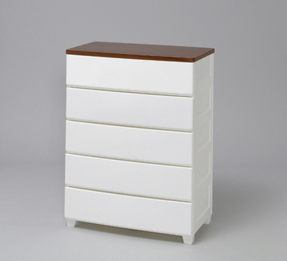 耐久性に優れた木天板でシンプルなデザインがお部屋をおしゃれにスッキリ見せるウッドトップチェストです。側面と後面にもカバーすることで、ホコリが入りにくくなっています。引き出しには開閉がスムーズな金属レールを使用しています。脚が付いており、掃除がしやすくなっています。