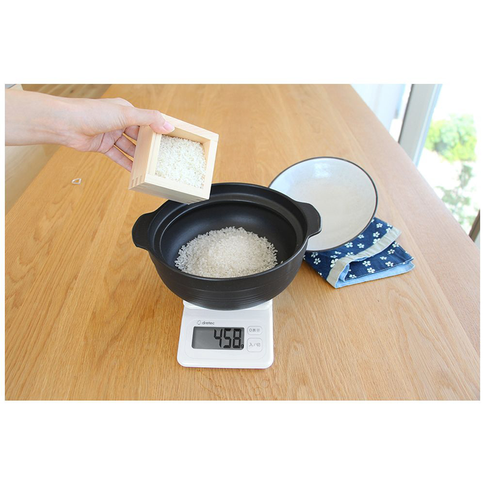 表示が見やすい大画面(約60×30mm)タイプのデジタルキッチンスケール。最大3kg、最小表示1g単位ではかれます(3000gまで)。