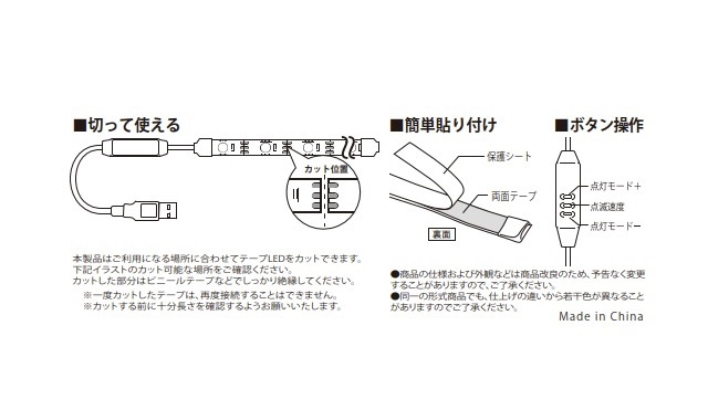 ●USBに挿すだけで点灯、コントローラで点灯モード、点滅速度を選べます。