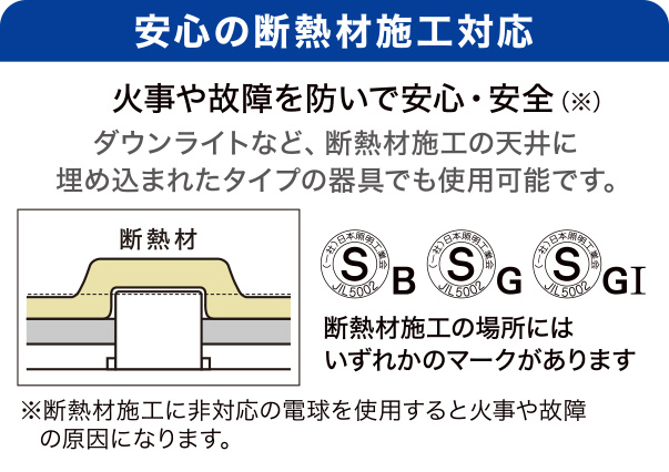 ダウンライトなど、断熱材施工の天井に埋め込まれたタイプの器具でも使用可能です。