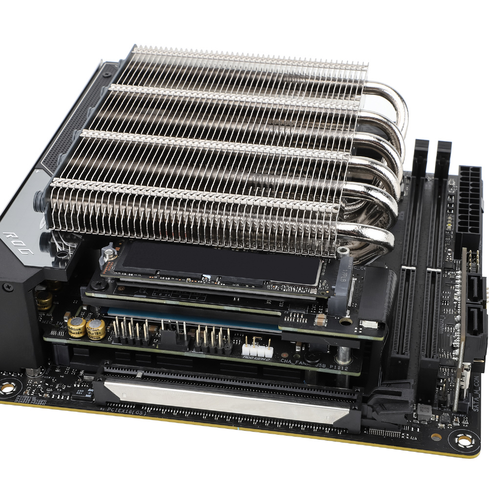 Mini-ITXマザーボードなどでメモリとの干渉を避けつつ、バックプレート側にも干渉しないようにベストな高さとなっております。ベースプレートはニッケルメッキを施したC1100銅製で、6本の6mm径ヒートパイプを介してヒートシンクに接続されています。高さの厳しい薄型ケースや小型ケースなどで、高い冷却性能を求めてる方にうってつけの製品と言えるでしょう。