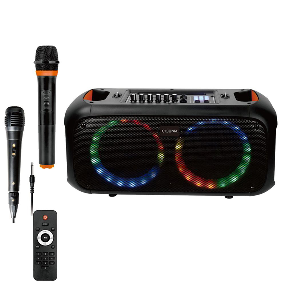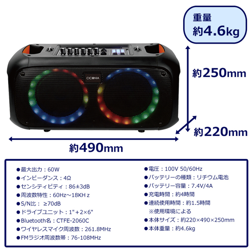 サークルLEDパーティースピーカー【ワイヤレスマイク・有線マイク各1本付属】 ブラック CTFE-2060C-BK