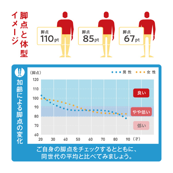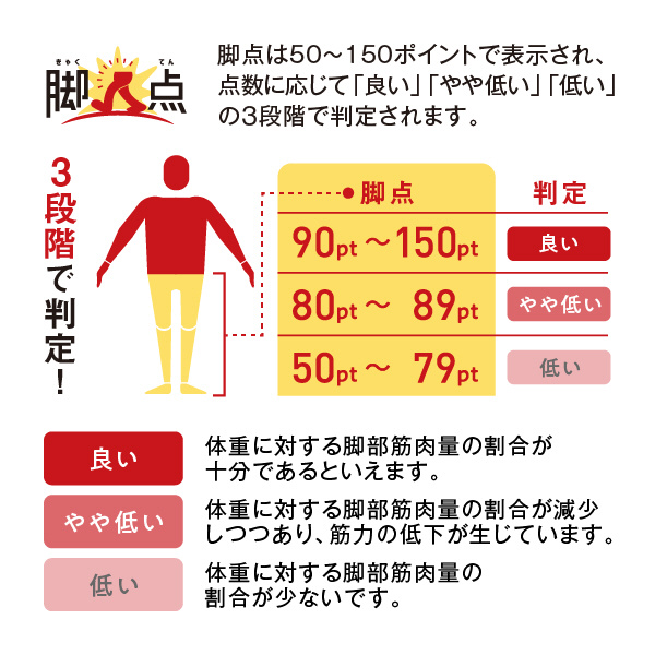 ・「脚点」は50〜150 ポイントで表示され、点数に応じて「良い」「やや低い」「低い」の3段階で判定。