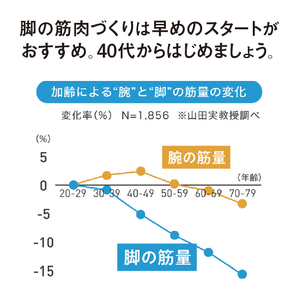 脚の筋肉づくりは早めのスタートがおすすめ。40代からはじめましょう。