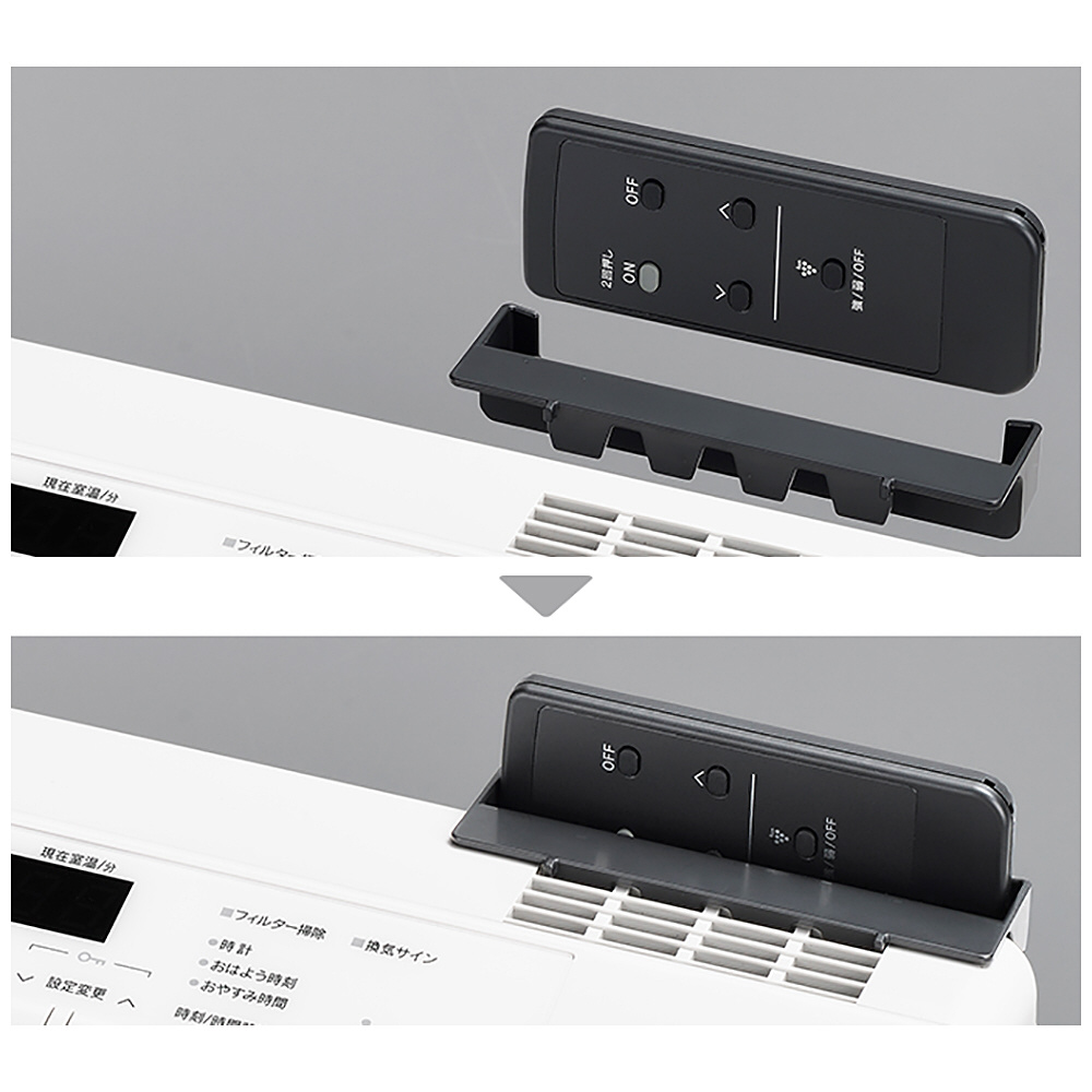 新たに、シンプルで使いやすいリモコンが付属。暖房のON/OFFをはじめ、 設定温度、スポット暖房能力の調整やプラズマクラスターイオン運転のコントロールも、 ベッドやソファーなどから動かずに行えます。ONスイッチ2回押しで暖房運転を開始します。 本体に取り付けられるリモコンホルダーも付属しています。