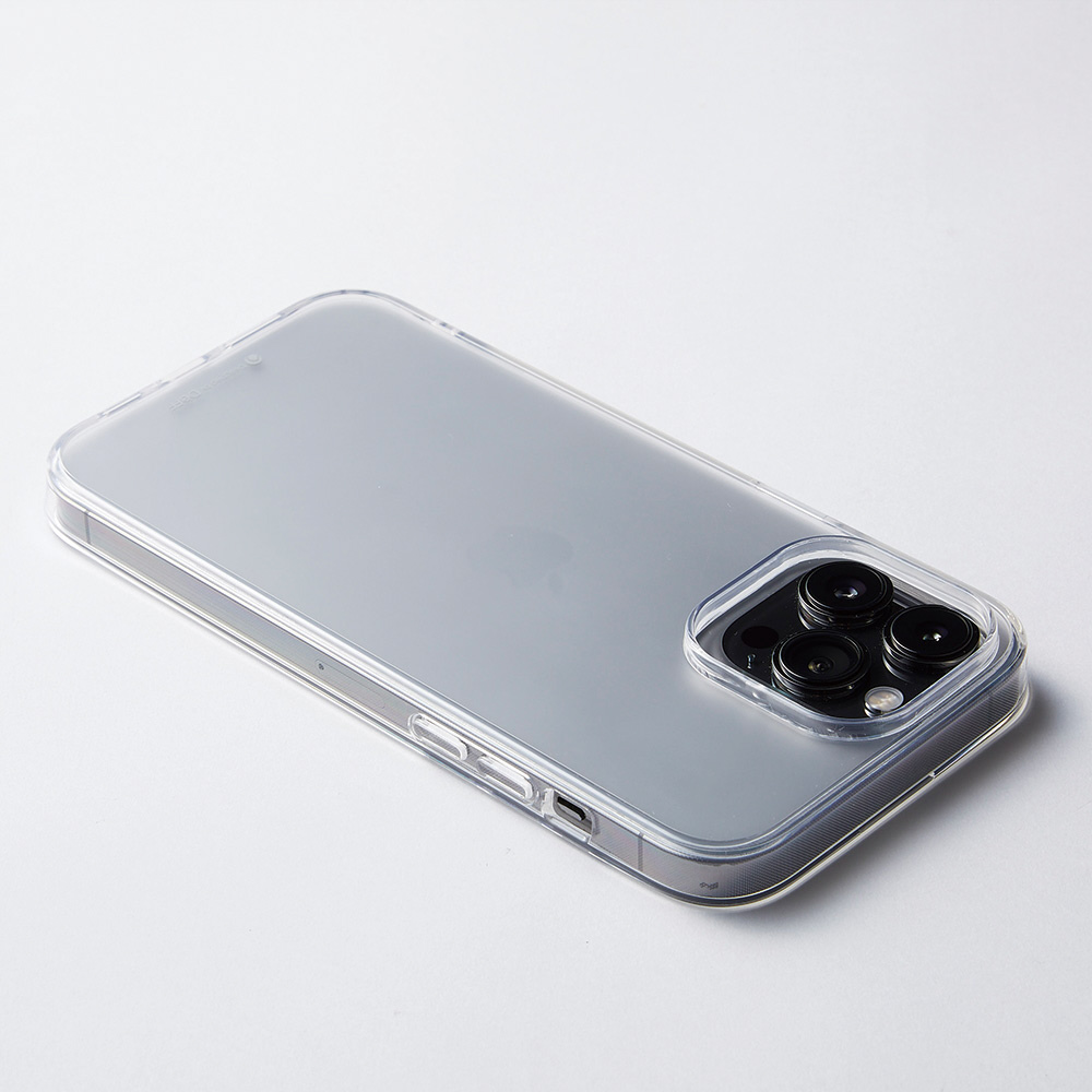 指紋や汚れが目立ちにくいフロスト処理を施した表面硬度9H以上の化学強化ガラスを背面に、周囲をTPUで組み合わせたシンプルですっきりとしたケースです。
