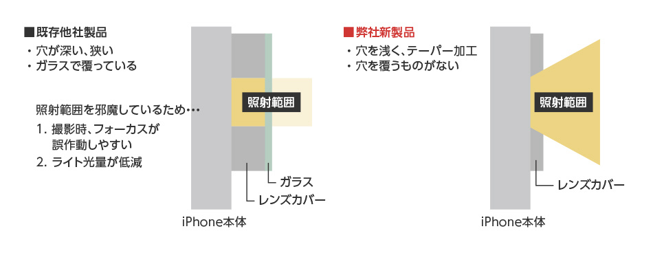 iPhoneはカメラレンズの飛び出し量が増えており、レンズ部分に傷が付いたり、破損するトラブルも多くなっています。本製品はこうした問題を未然に防ぐプロテクターです。本体は一つひとつ削り出したアルミニウム合金製。強靱なボディはiPhoneの精密なカメラユニットを外部の衝撃から守ります。ガラス部分はAGC製ガラスを高精度にはめ込みました。カバーガラスとレンズの隙間は0.1mm以下に抑えており、撮影時の光学的な影響を最小限度に留めるよう調整しています。