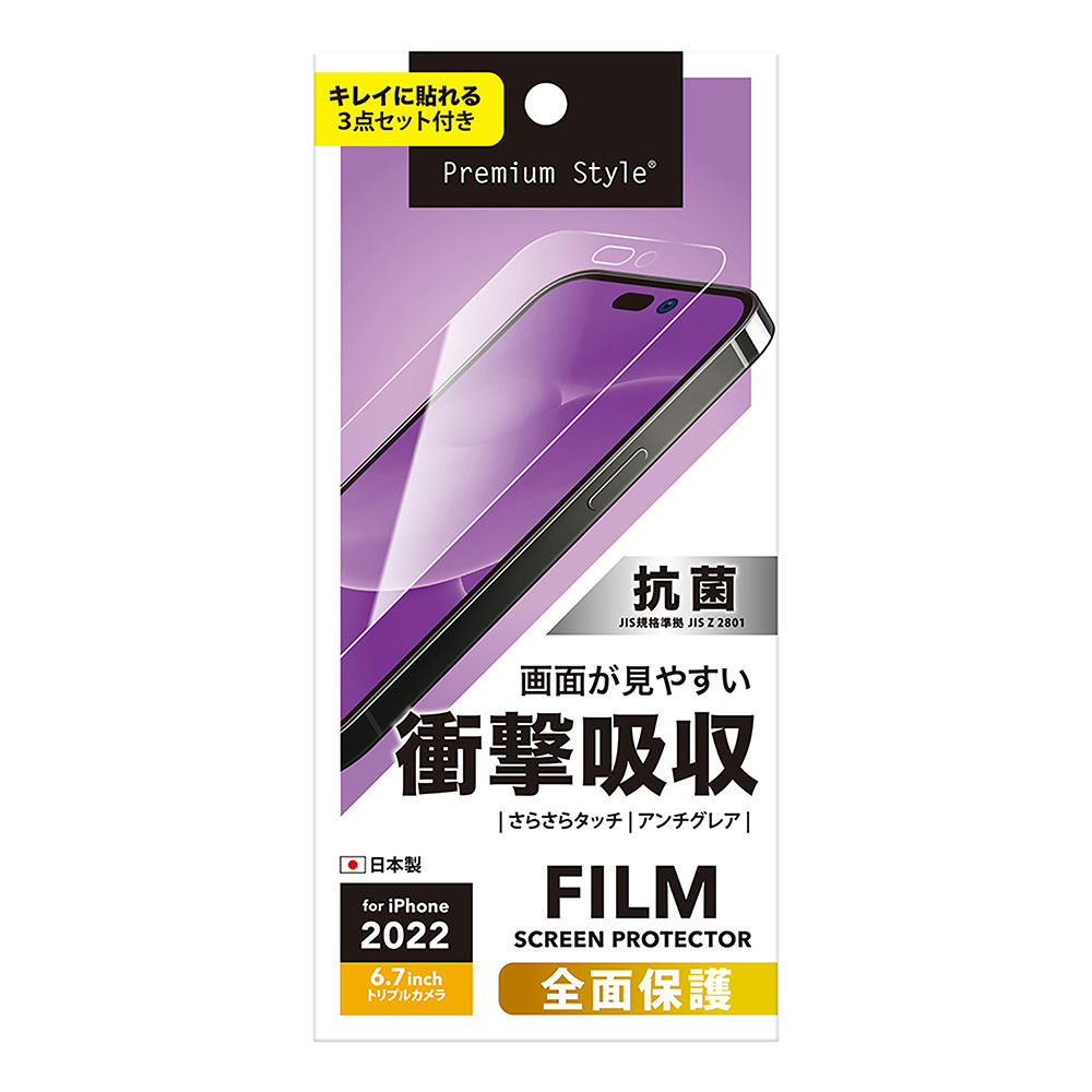 衝撃とキズから画面を守り、液晶画面に加わる衝撃を吸収するアンチグレアタイプの2022年 iPhone 6.7inch トリプルカメラ用 液晶全面保護フィルムです。液晶画面を衝撃から守り、液晶割れを防ぐ効果があるのでスマートフォンを落として割ってしまうのではないかと心配されている方にオススメです。光の反射を抑える、アンチグレア加工を施し、太陽光や照明などの下でも視認性を向上させます。かんたんに貼れるバブルブロックタイプ。JIS規格(JIS Z2801)に準拠した抗菌仕様。保護ケースに干渉しにくい安心設計。フィルム貼り付けに便利なヘラ、クリーニングクロス、ほこり取りシールが付属しています。