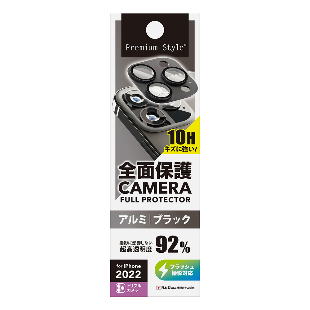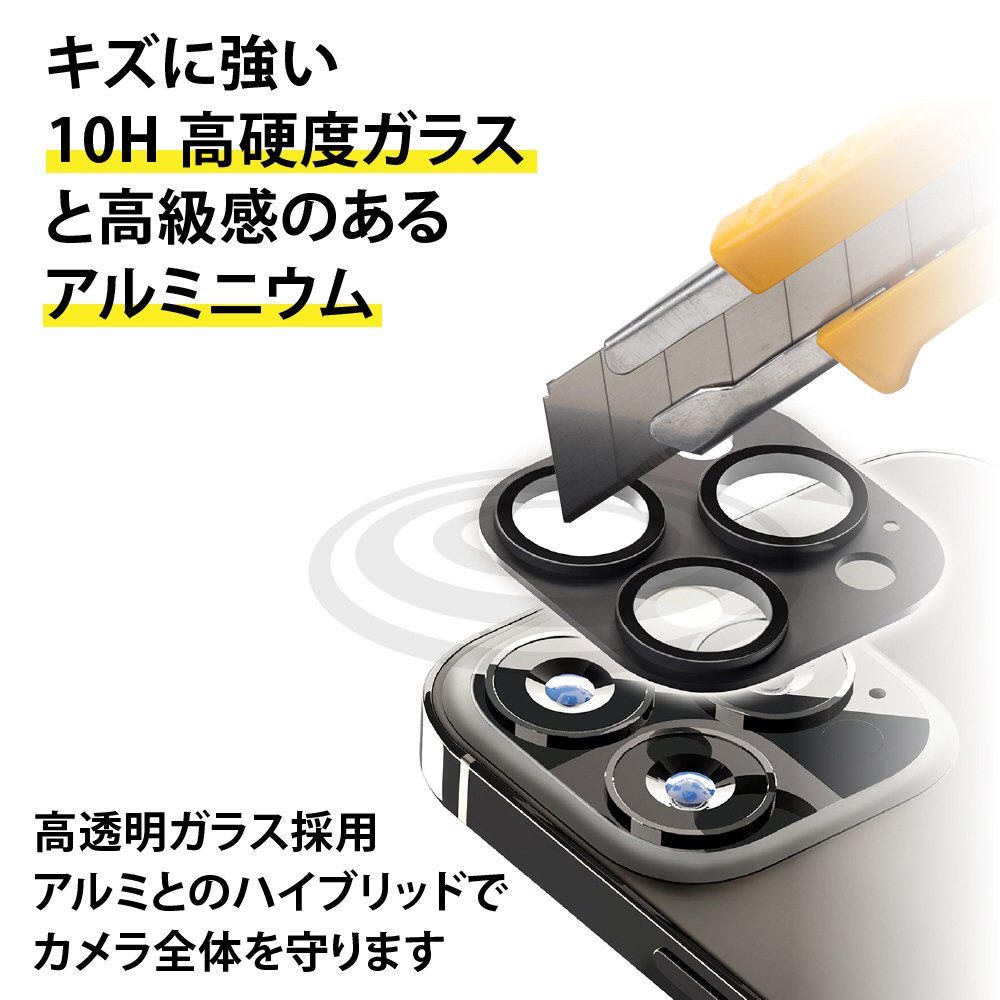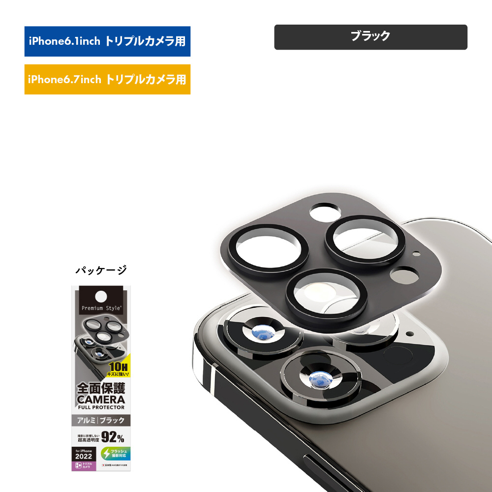 2022年 iPhone トリプルカメラ用のカメラフルプロテクターです。カメラフルプロテクターは光線透過率92%の表面硬度10H光沢ガラスと高級感のあるアルミフレームで端末本体のカメラレンズ周りからLEDライト部までキズを付けず、美しくカメラレンズを守ります。貼り付け時に便利なクリーニングクロス・ほこり取りシール付き。