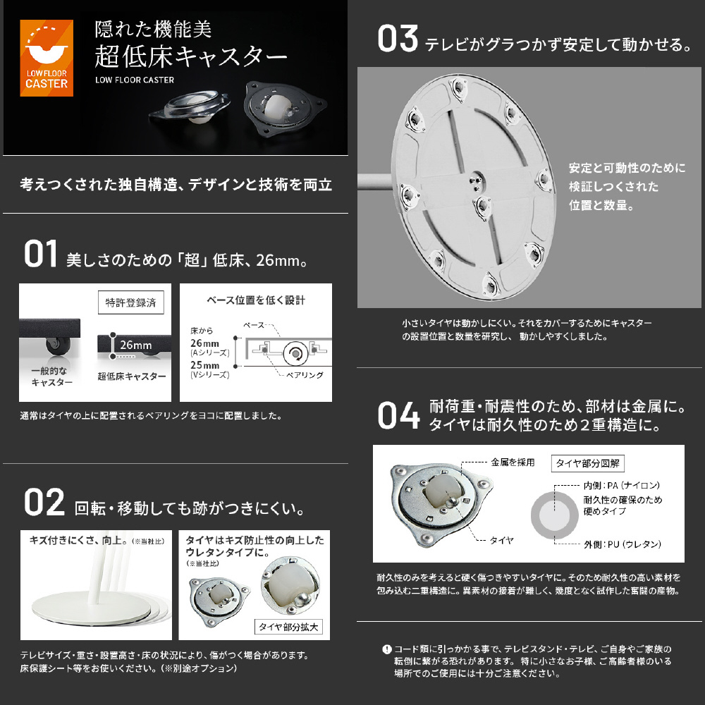 「見たい場所へ、使う場所へ。」移動に便利な薄型の低床キャスター付きのWALL TVスタンド A2ハイタイプ。
