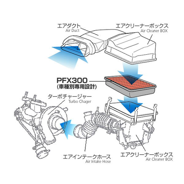 PFX300は、高い集じん効率と低い吸気抵抗を両立した、車種専用設計のトレードインタイプフィルターです。
