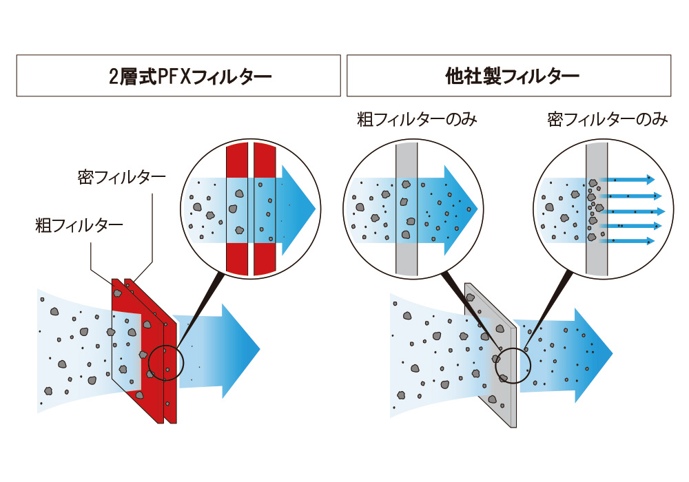 ■10μmクラスのNo.1フィルター、1μmクラスの No.2フィルターの 2層 2段階集塵によって、清浄効率 98%を実現しました。他社スポーツフィルターの様に砂を吸い込むことはありません。