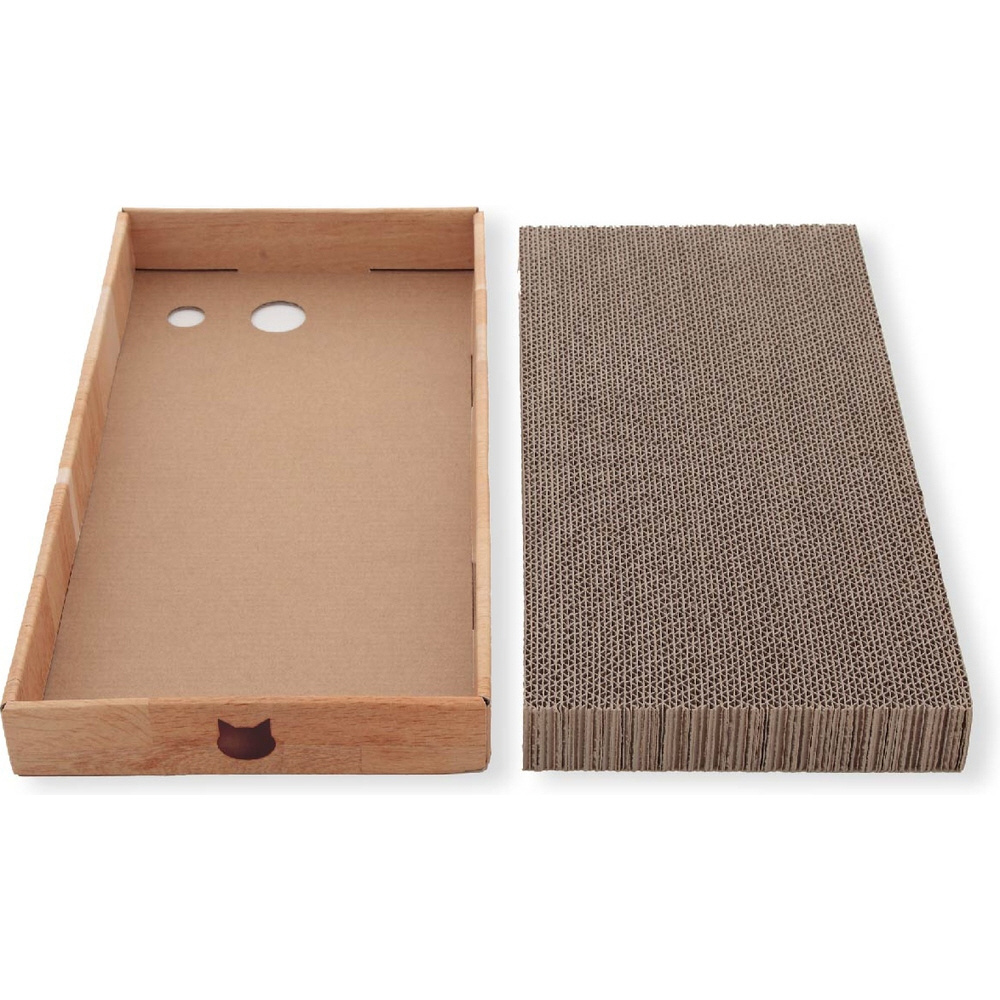 つめとぎ部分に使用しているダンボールは、原料の100%が紙。大切な猫に使用するつめとぎなので、品質にはとことんこだわりました。ダンボールを貼り合わせる糊は植物由来の糊を使用しています。
