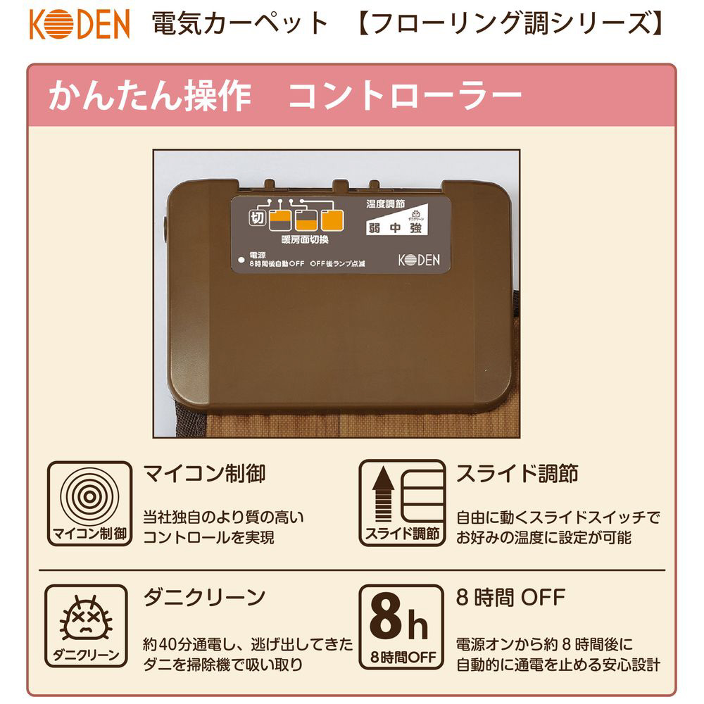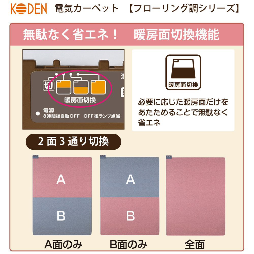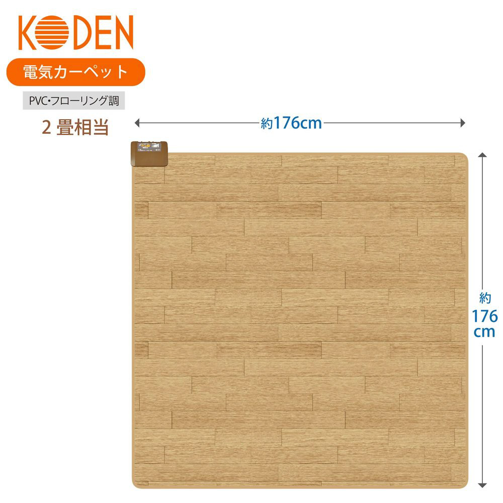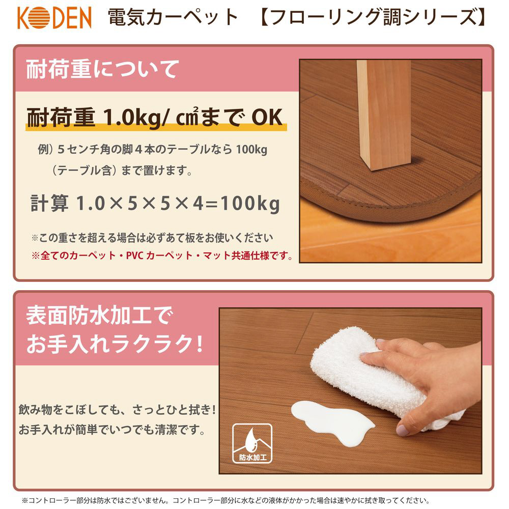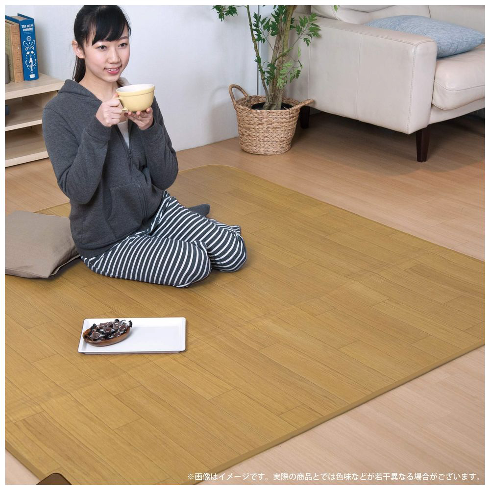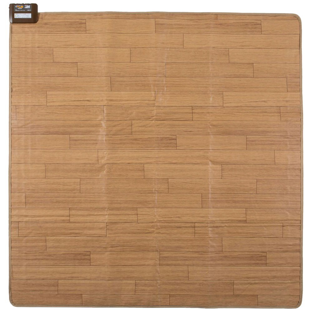 フローリングの床にも馴染むブラウンの木目調柄で、表面防水加工の2畳相当サイズ電気カーペット。