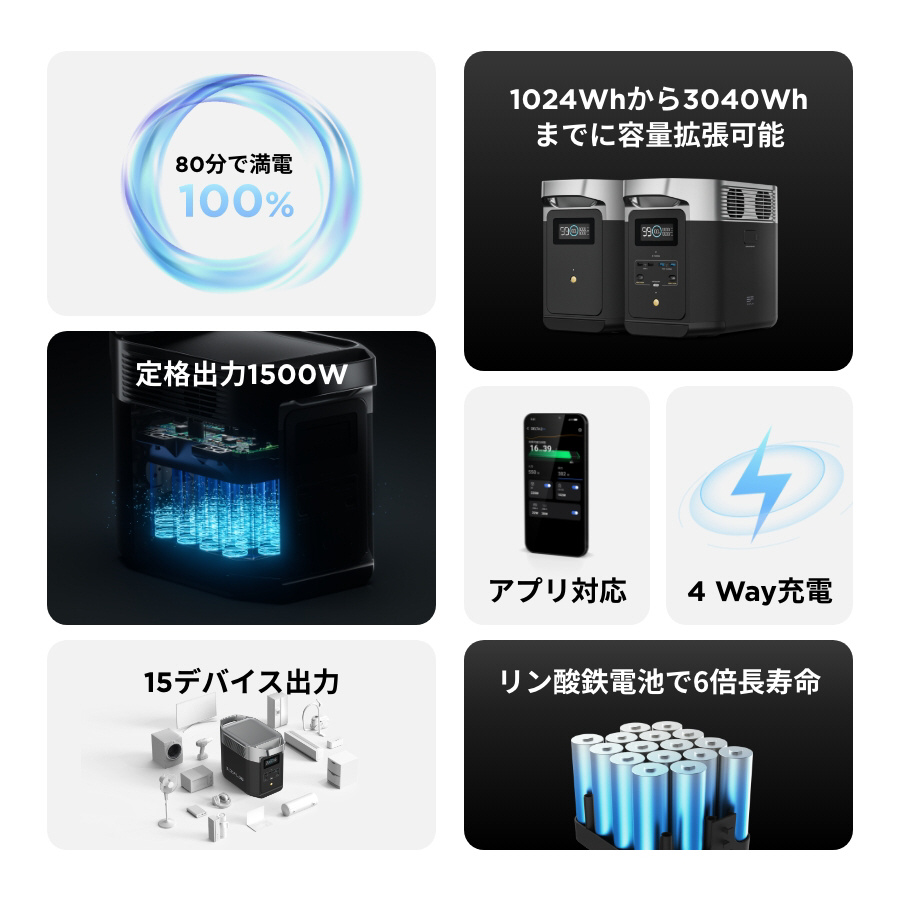 DELTA 2の容量は、DELTA 2専用エクストラバッテリーの使用で1,024Whから2,048Whに、