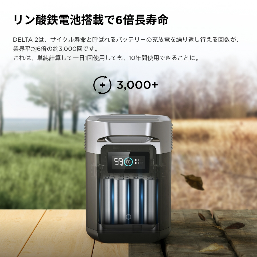 テスラと同一の化学組成を持つバッテリーにより、DELTA 2は、容量80%充電で3000回まで長寿命化、