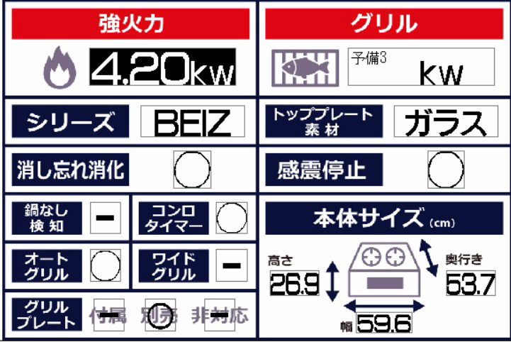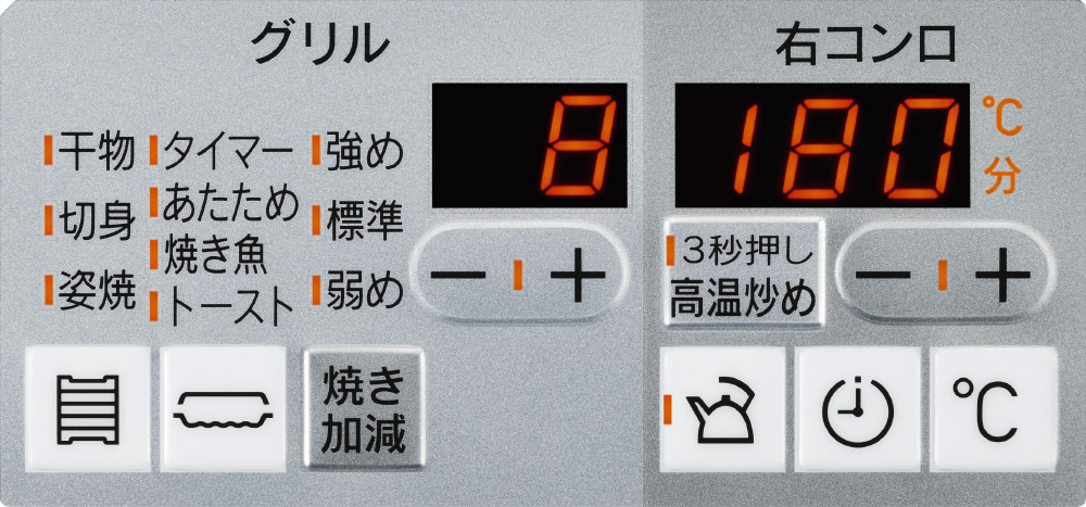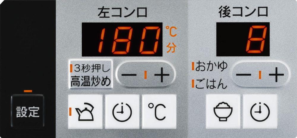 強火力バーナー(左右コンロ)に温度設定機能・高温炒め・タイマー機能・湯わかし機能、小バーナー(後コンロ)に炊飯機能(ごはん・おかゆ)・タイマー機能を搭載しています。