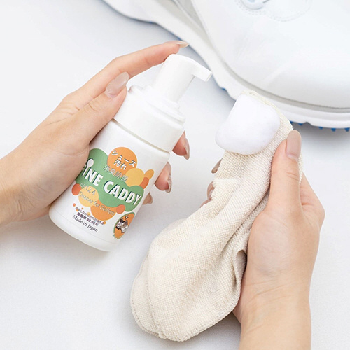 水を使わず洗えるフィーネキャディのシューズ泡シャンプー