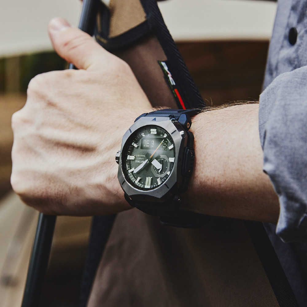 ■荒々しいアウトドアスタイルをデザインテーマに定め、武骨な薪割りの斧をイメージした、側面を削ぎ落としたシャープな形状のメタルベゼルを採用しました。