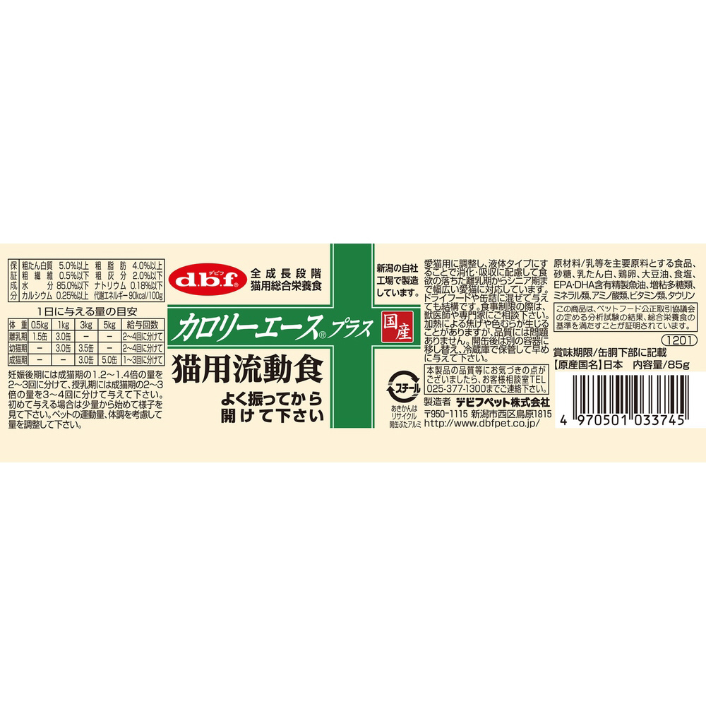●保証成分:粗たん白質5.0%以上、粗脂肪4.0%以上、粗繊維0.5%以下、粗灰分2.0%以下、水分85.0%以下、ナトリウム0.18%以下、カルシウム0.25%以上