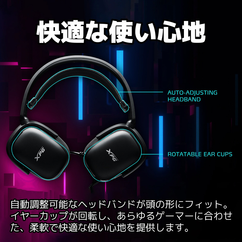 自動調整可能なヘッドバンドはユーザーの頭に適応し、イヤーカップは回転するため、あらゆる形状やサイズのさまざまなゲーマーに柔軟性と快適性を提供します。