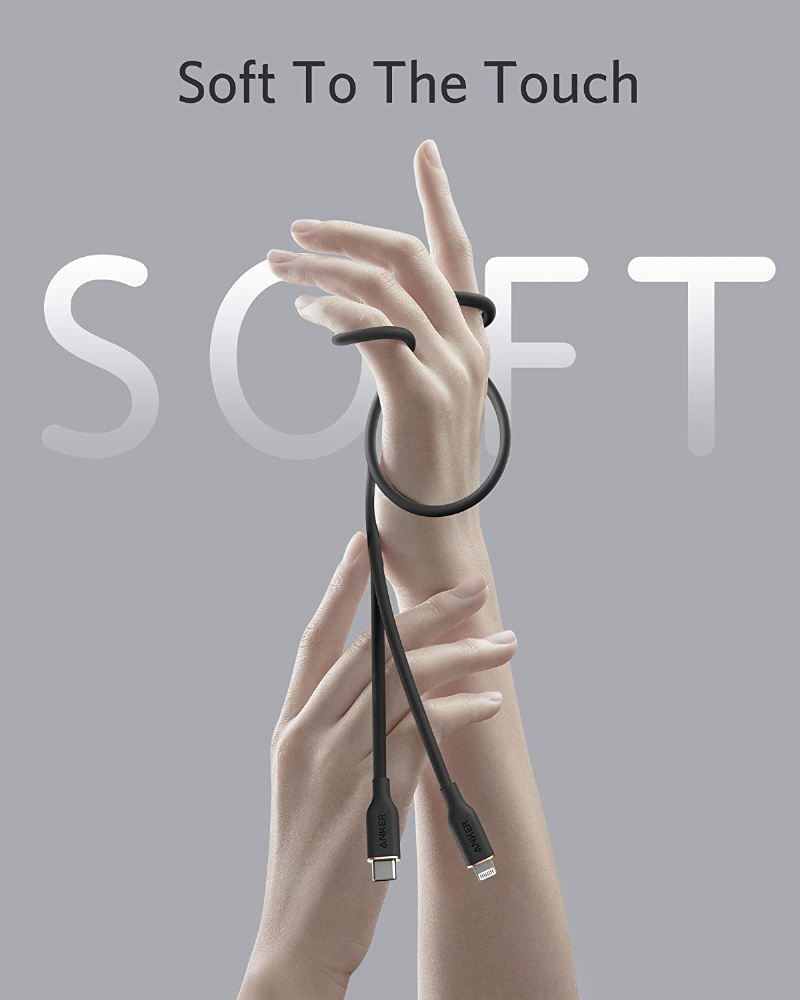 ケーブル内部の銅線をグラフェンで覆い、外装にシリコン素材を使用した3層構造を採用し、従来のケーブルにはないやわらかさを実現しました。肌に優しい使い心地をお楽しみいただけます。