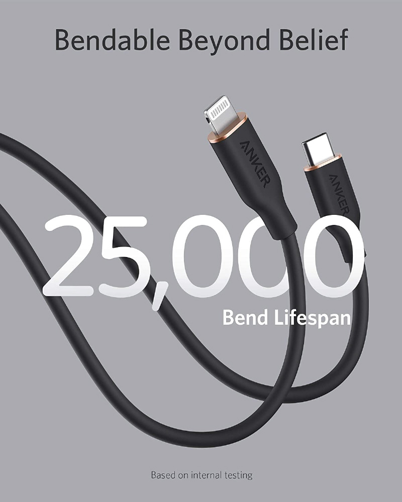 約25,000回の折り曲げにも耐える優れた耐久性を実現しているため、ケーブル内部のワイヤーを断線から保護し、安心して充電することができます。