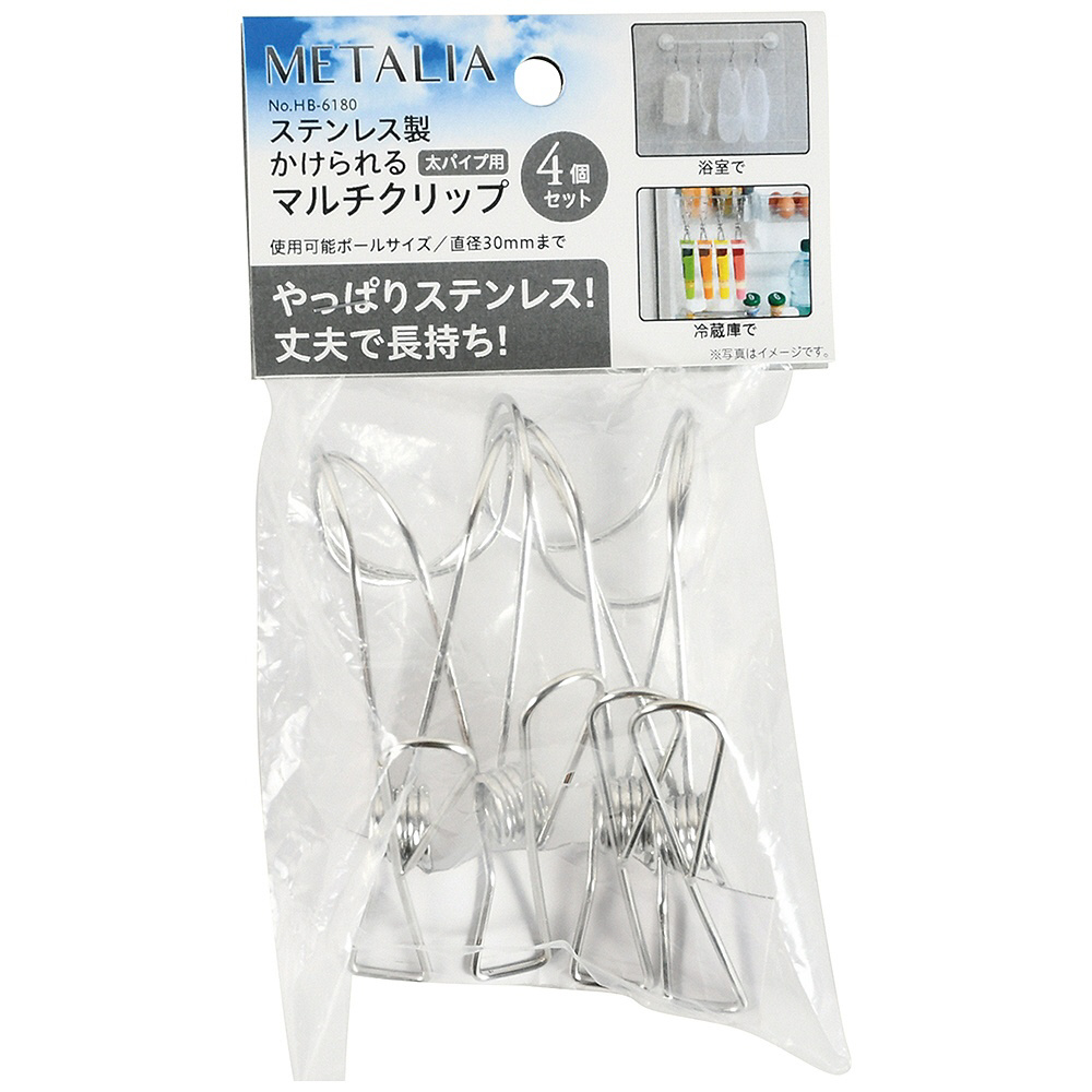 ステンレス製かけられるマルチクリップ4個セット太パイプ用 メタリア HB-6180