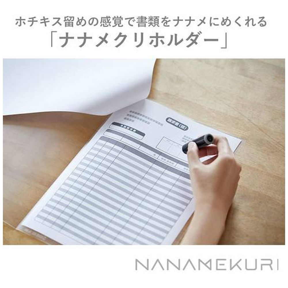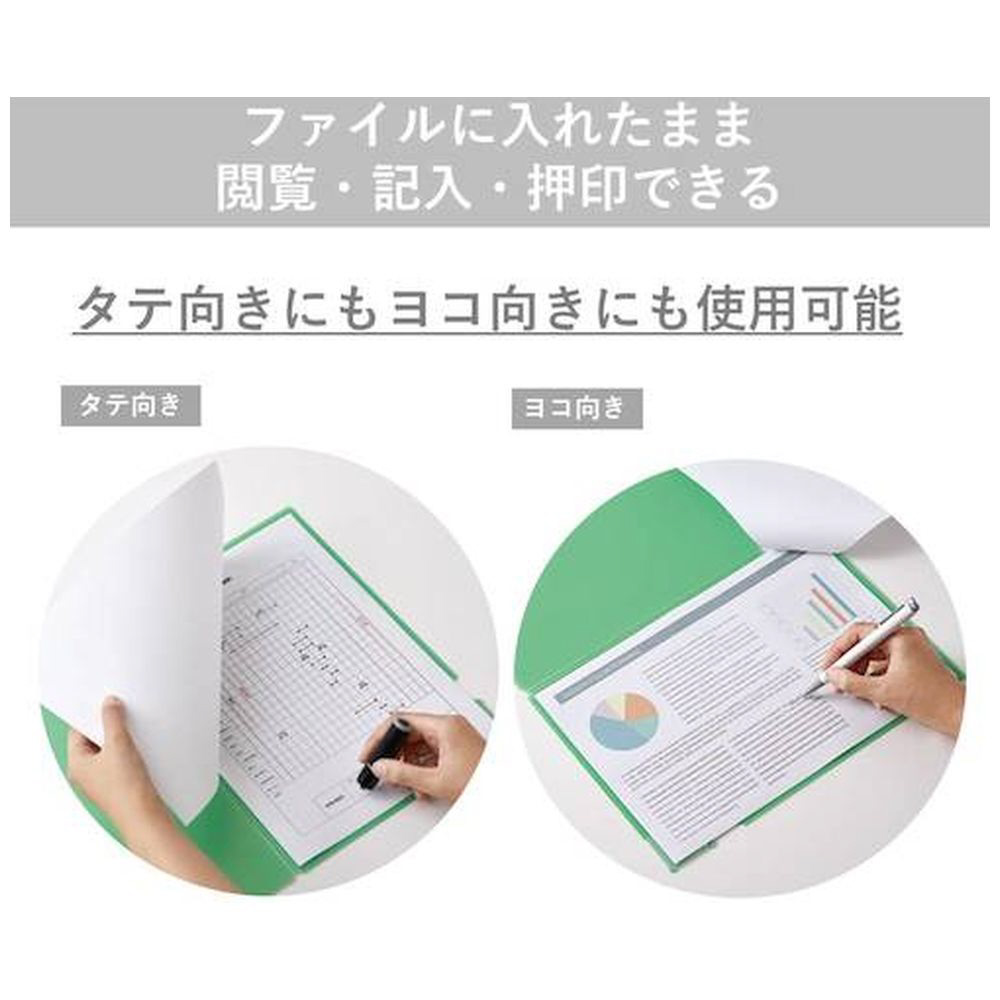 【特長】●書類がナナメにめくれます。●書類を角に挿しこめば、ホチキス留めの感覚で閲覧可能です。●書類の出し入れが不要です。●書類を入れたまま閲覧・記入・捺印ができます。●書類脱落防止ポケット付きです。●書類が脱落しないように保持するポケット付きです。●ポケットから書類が出しやすいよう、裏表紙には指掛けがあります。