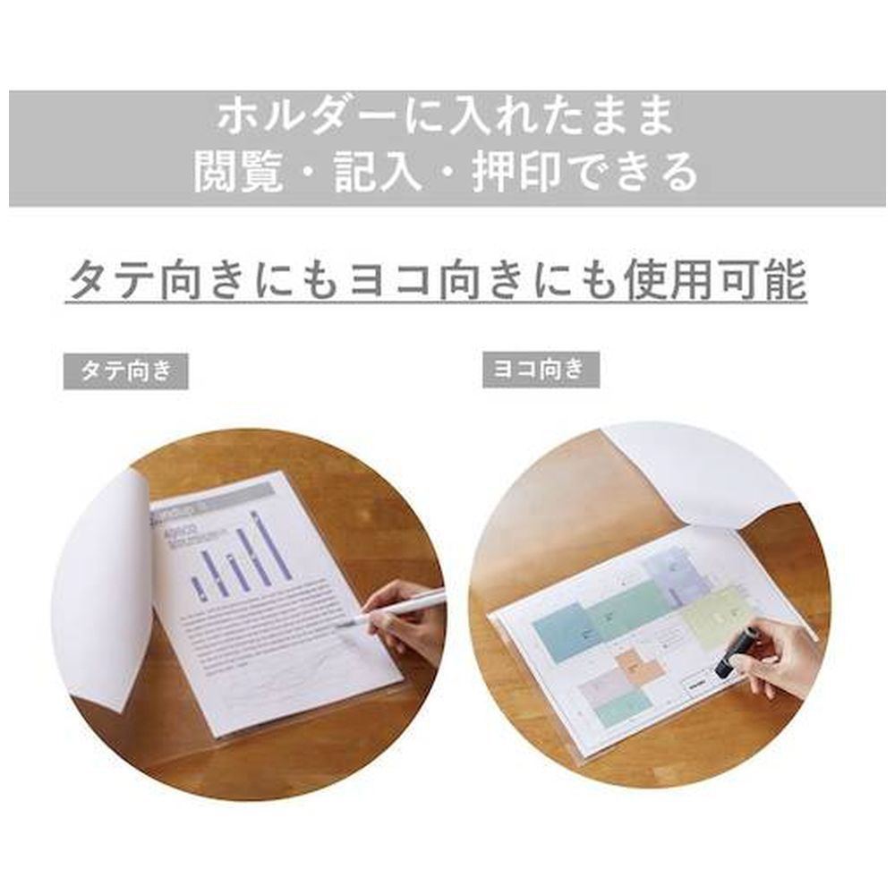 【特長】●書類がナナメにめくれます。●書類を角に挿しこめば、ホチキス留めの感覚で閲覧可能です。●書類の出し入れが不要です。●書類を入れたまま閲覧・記入・捺印ができます。●書類脱落防止ポケット付きです。●書類が脱落しないように保持するポケット付きです。●ポケットから書類が出しやすいよう、裏表紙には指掛けがあります。