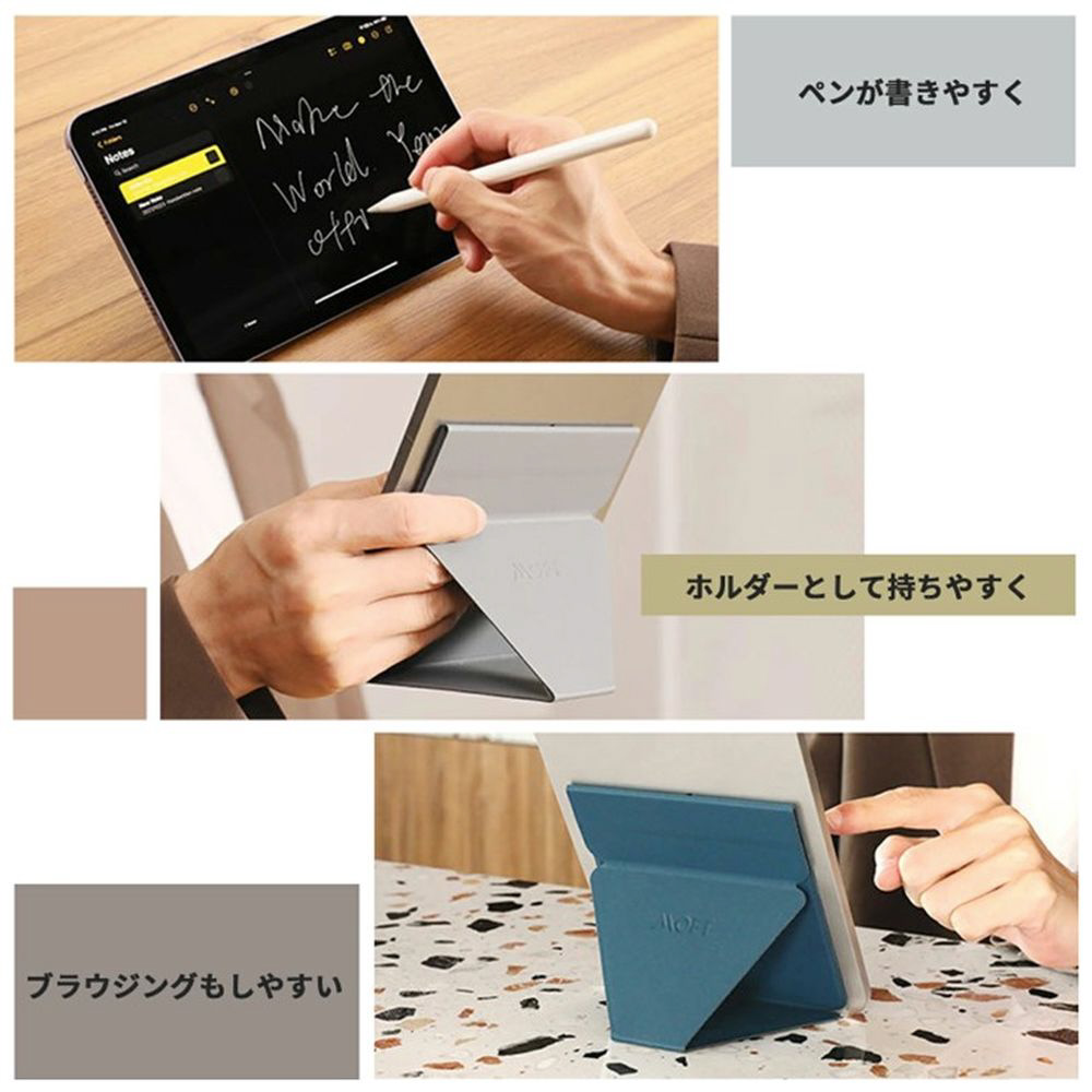 ※ MOFT Xタブレットスタンドは背面が凹凸加工されている機種や、模様の入ったケースなどにはご使用にならないことをおすすめします。