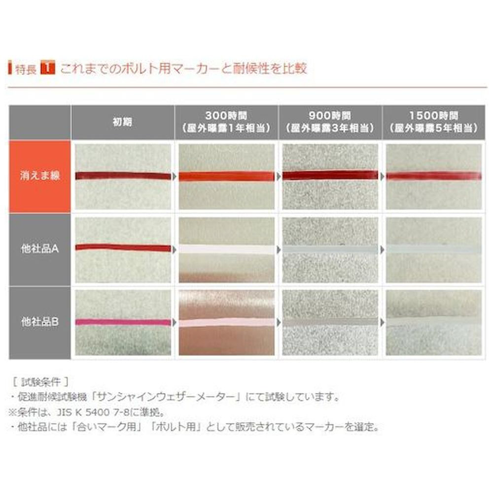 ●耐候性が抜群で、描いた線や文字が消えません。●屋外曝露5年相当の促進耐候試験後でも線の認識が可能です。●屋外曝露5年相当の促進耐候試験後の色差がΔE7.3です。