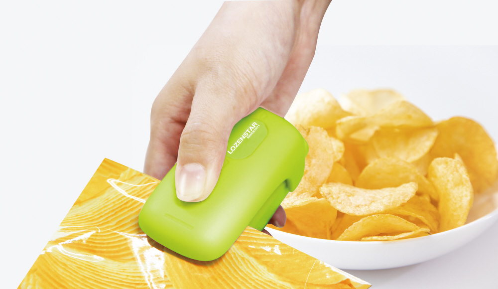 ■食べかけのお菓子の袋など、はさんでスライドするだけで、ヒーターの熱により圧着、密封し、中身が湿気るのを防ぎます。