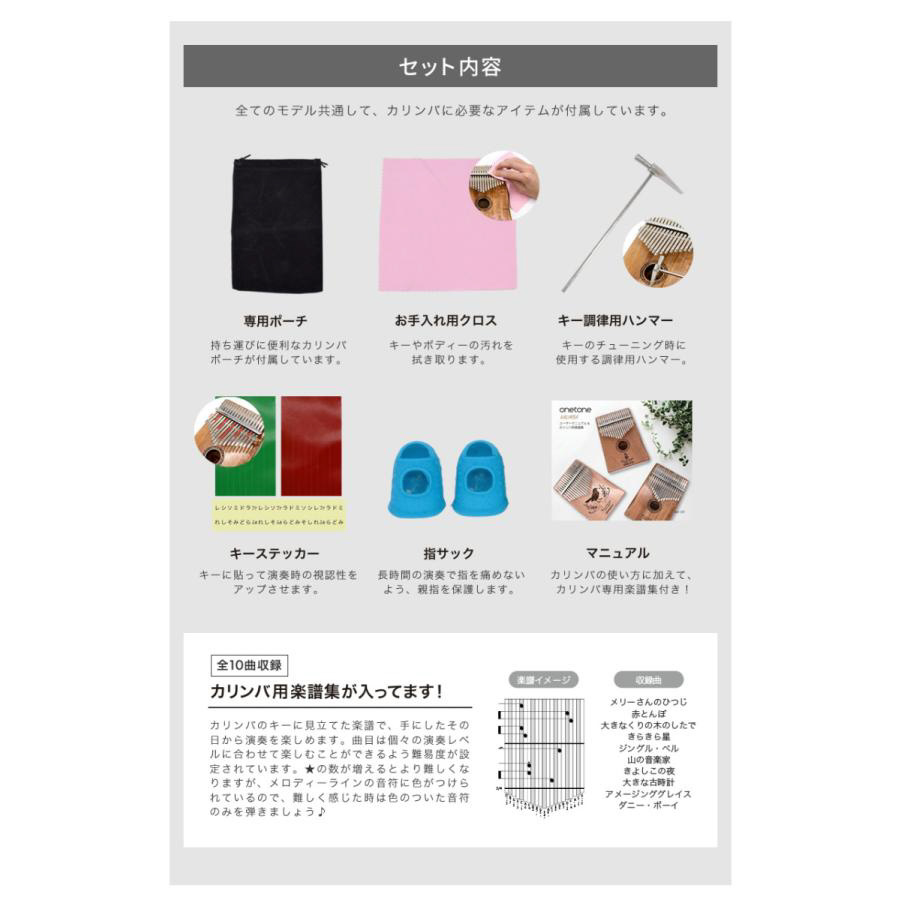 ●付属品:ソフトケース、クリーニングクロス、指サックx2、キーステッカー、キー調整用ハンマー、日本語マニュアル&カリンバ用楽譜集